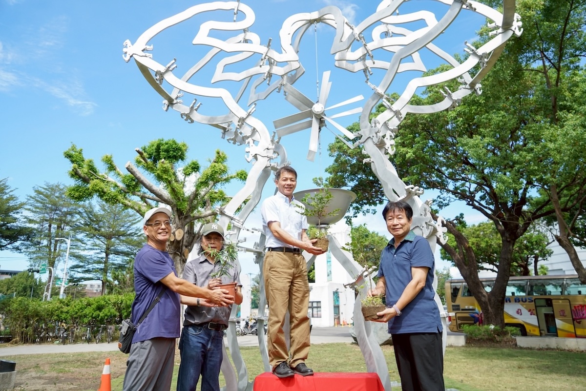 國立臺灣藝術大學欣逢創校七十週年,為展現藝術教育的深耕傳承與校友情誼,本校校友總會理事長陳志芬與全體理監事,特別邀請本校雕塑學系教授暨藝專時期優秀校友劉柏村教授,創作大型公共藝術作品《綠‧金剛》,並慷慨贊助作品裝置材料費,共同捐贈予母校,象徵「藝承七十、創新永續」的精神。 《綠・金剛》藝術品捐贈歷時數月,分為簽約、植土與捐贈三個重要階段,見證作品從構想到落成的完整歷程。8月21日舉行簽約儀式,由鐘世凱校長、劉柏村教授及校友總會理事長陳志芬共同簽署捐贈協議,象徵校友情誼與藝術精神的延續。 接續於10月17日舉行的「植土儀式」,更是整個創作過程中最具象徵性的環節。現場特別將培養土與臺藝大校園的土壤混合,由鐘世凱校長親自將混合後的土壤連同植栽一同置入作品中心,寓意作品與校園土地血脈相連,象徵藝術根植母校、與環境共榮的精神。植土儀式由鐘世凱校長、劉柏村教授與校友總會副理事長邱俊維共同執行,見證藝術能量在臺藝土地上萌芽生長,延續生命與創造的力量。 10月24日校慶典禮當日,則舉行《綠・金剛》捐贈揭幕儀式,由鐘世凱校長主持,並邀請作品創作者劉柏村教授、校友總會理事長陳志芬、前行政院政務委員暨本校前校長黃光男校長、陳嘉成副校長等貴賓擔任剪綵嘉賓;同時由五院院長——美術學院劉俊蘭院長、設計學院傅銘傳院長、傳播學院吳珮慈院長、表演藝術學院曾照薰院長、人文學院劉俊裕院長及謝文啓主任秘書共同揭綵,儀式簡單隆重。校友總會也特別安排兩位舞蹈學系校友代表獻上花束,向劉柏村教授及《綠・金剛》致上最誠摯的敬意與祝福。花束獻禮象徵藝術薪火的傳遞與校友對母校情誼的延續,現場掌聲不斷,氣氛溫馨感人,為整場儀式畫下優雅而動人的句點。 劉柏村教授長年以鋼鐵為創作語彙,其作品兼具時代性與人文思考,是臺灣雕塑界的重要代表之一,並多次受邀參與國際藝術展覽,享譽藝壇。此次捐贈的《綠・金剛》延續其「金剛系列」創作精神,以鋼鐵結構象徵堅毅的力量,結合自然植栽呈現生命的延續與再生。作品中心的金剛植栽盆特別盛裝自校園取土,象徵藝術與土地的連結,體現自然與人文、環境與教育的和諧共存。劉教授以此作品傳達「人與自然共生、藝術與環境對話」的理念,呼應當代永續精神,也映照臺藝大七十年來堅定前行與不斷創新的教育使命。 鐘世凱校長表示,《綠・金剛》的落成,是臺藝大七十週年最具意義的禮物之一,不僅象徵校友情誼與藝術教育的薪火傳承,更展現學校凝聚力與藝術實踐的力量。他特別感謝劉柏村教授的創作奉獻,以及校友總會理監事的慷慨支持,使藝術精神能夠在校園中持續發芽茁壯。他指出,《綠・金剛》所展現的堅毅、共生與永續精神,正是臺藝大持續追求卓越、邁向新里程的重要象徵。未來,學校將以此為契機,推動更多校友與師生參與公共藝術創作,讓藝術成為校園中最具生命力的風景,共同描繪屬於臺藝的嶄新篇章。